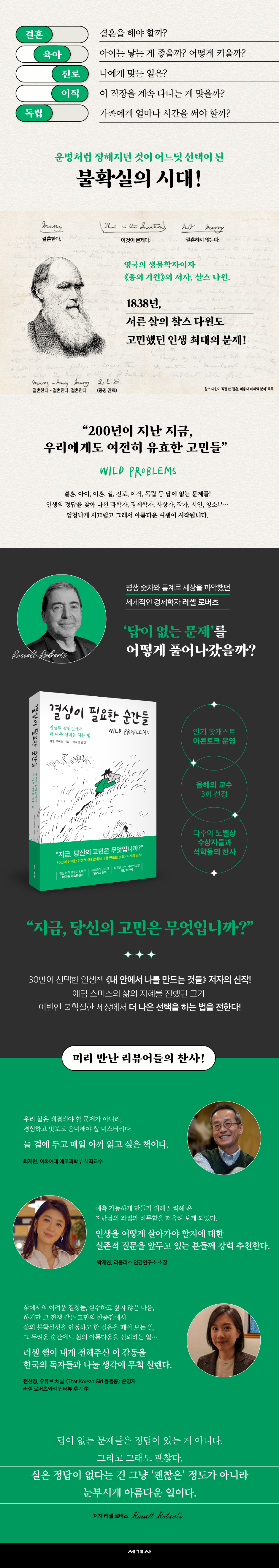 〈타임 매거진〉 기사에 따르면 인간은 매일 수천 개의 크고 작은 결정에 직면한다고 한다. 그 수가 하루 평균 35,000개에 이른다는 연구 결과도 있다. ‘고민하는 존재’, 인간의 숙명인 것이다. 그중에는 어떤 색 옷을 입을지 혹은 어떤 음료를 마실지 같은 소소한 문제도 있지만, 우리를 진짜 고민하게 하는 것은 결혼, 출산, 취업, 이직, 독립 등과 관련된 인생의 중대사들이다. 결혼을 할 것인가 말 것인가, 아이를 가질 것인가 말 것인가 같은 문제들을 저자는 ‘답이 없는 문제’라고 부른다. 말하자면 인생의 갈림길 같은 것으로, 어느 쪽이 옳은지도 분명하지 않고 이 길을 택했을 때 다른 길의 결과는 끝까지 알 수 없으며 지금의 선택이 나라는 사람을 규정하고 내 미래 또한 결정한다. 가 보기 전에는 어느 길이 최선인지 답을 알 수 없는 것이다. 미래를 알 수 없으니 우리는 불안하고 불안하니 결정을 미룬다.