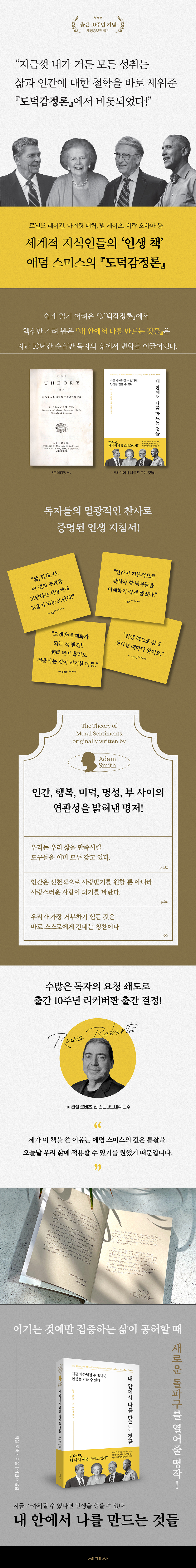 그는 더 나은 삶, 잘 되는 나를 만들기 위해 가장 중요한 것으로 ‘자기 자신을 잘 아는 것’을 꼽았다. 그리고 이에 대한 주옥같은 해답을 사람과 인생에 대한 통찰력이 빛나는 불후의 역작인 『도덕감정론』에 정성스레 담아냈다.